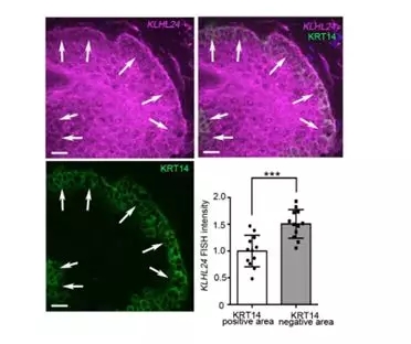 通過(guò)FISH,發(fā)現(xiàn)在正常和病人來(lái)源的皮膚樣本中,基底層角質(zhì)細(xì)胞較基底上層角質(zhì)細(xì)胞的KLHL24表達(dá)量更低,而KRT14的含量則與此相反(Fig. 6)。