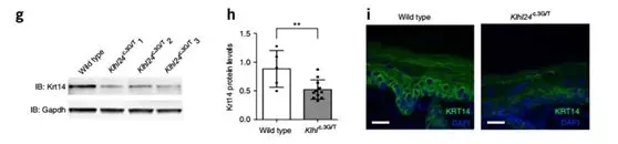 同時(shí),Klhl24c.3G/T小鼠皮膚樣本中,Krt14含量較野生型降低(Fig. 7g–i),降低程度顯著但仍高于患者皮膚Krt14含量,此現(xiàn)象在一定程度上解釋了Klhl24c.3G/T小鼠為何沒(méi)有皮膚脆性表型。