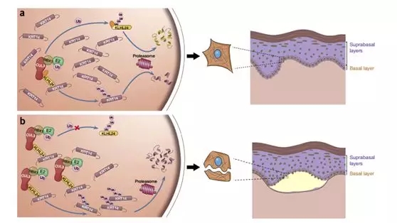 綜合以上基因分析及生化實(shí)驗(yàn)結(jié)果可知,KLHL24可作為E3泛素連接酶作用于底物KRT14,其功能獲得性突變體KLHL24-∆N28會(huì)導(dǎo)致底物KRT14的過(guò)度降解使皮膚完整性受損。