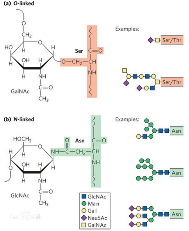 許多糖蛋白同時具有N-連接的糖鏈和O-連接的糖鏈。O-連接的糖基化在高爾基體中進行,通常第一個連接上去的糖單元是N-乙酰半乳糖,連接的部位為Ser、Thr和Hyp的羥基,然后逐次將糖基轉移到上去形成寡糖鏈,糖的供體同樣為核苷糖,如UDP-半乳糖。糖基化的結果使不同的蛋白質打上不同的標記,改變多肽的構象和增加蛋白質的穩(wěn)定性。