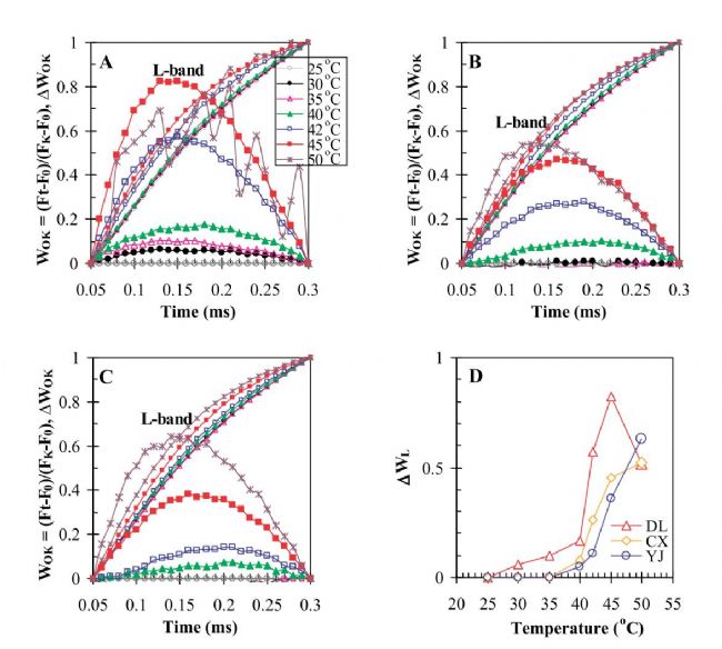根據(jù)JIP-test的分析表明,放氧復(fù)合體(OEC)的抑制和PS2反應(yīng)中心的失活是熱損傷的主要原因。在中度熱脅迫(<40℃),輕微地傷害了OEC但是沒有在OJIP曲線上引起明顯的K點。在重度熱脅迫(≥40℃),在OEC上不可逆的顯著傷害導(dǎo)致了明顯的K點上升。
