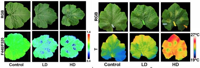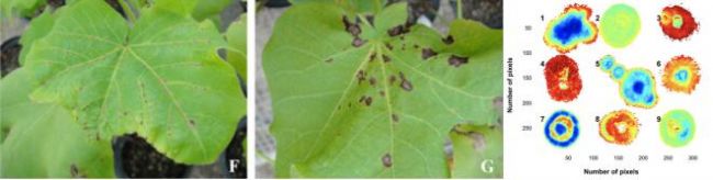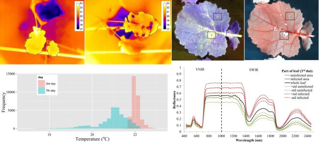 上圖左為在接種(Alternaria brassicae)3天(左)和7天(右)油菜葉的熱成像圖及葉片溫度分布的頻率直方圖;上右圖為接種鏈格孢(Alternaria alternata)油菜葉的高光譜成像圖與光譜曲線。