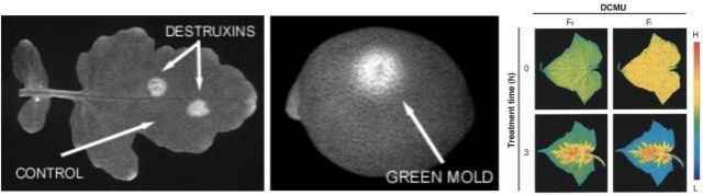 FluorCam葉綠素熒光成像技術作為植物光合作用的非損傷性2D探針,最早應用于植物病害檢測及表型分析研究等。下圖研究結果引自早期的兩篇學術論文“J Soukupova, et al. Early detection of biotic and abiotic stress by kinetic imaging of chlorophyll fluorescence, 2001.”和“J Kim, et al. In vivo monitoring of the incorporation of chemicals into Cucumber and Rice leaves by chlorophyll fluorescenc imaging, 2002”