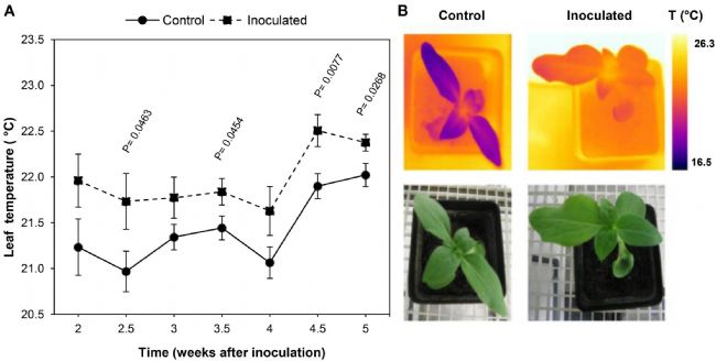 上圖為接種O. cumana向日葵和未接種(對照)植株的葉片的溫度變化。(A)兩種處理的葉溫的平均測量值。(B)接種后2.5周和對照植株的前兩對葉片的RGB成像圖和熱成像圖。