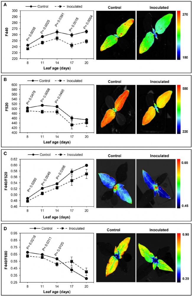 下圖左為接種O. cumana向日葵和未接種(對照)植株在整個葉發(fā)育過程中的多光譜熒光參數(shù)F440(A),F(xiàn)520(B),F(xiàn)440 / F520(C)和F440 / F680(D)平均值。上圖右為8日齡葉片的各個參數(shù)熒光圖像。