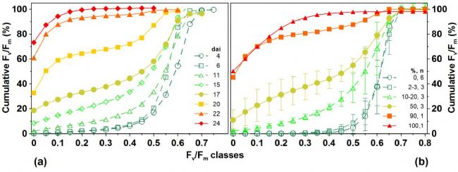 上圖為累積Fv / Fm值(%),(a)在單個麥穗的枯萎病發(fā)展的不同時期(b)在11天的不同感染水平下麥穗的Fv / Fm值的平均累積百分比。