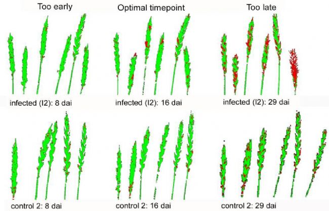 案例二:德國萊布尼茨農業(yè)工程研究所研究人員利用FluorCam葉綠素熒光成像與Specim高光譜成像對感染鐮刀菌的小麥穗早期癥狀進行檢測。超過疾病嚴重程度5%(6 dai)的感染限度,葉綠素熒光成像可靠地識別感染的麥穗。高光譜成像在接種后7天容易檢測到病癥,直至疾病嚴重程度為50%。