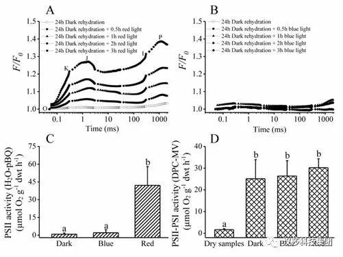 近期華中師范大學(xué)邱寶勝課題組利用英國(guó)Hansatech公司制造的Handy PEA植物效率分析儀和Chlorolab-2氧電極測(cè)定了不同光質(zhì)和光強(qiáng)對(duì)發(fā)菜補(bǔ)水后光合活性恢復(fù)過(guò)程中OJIP曲線、光合放氧速率和電子傳遞活性的變化,并結(jié)合膜分離和免疫印跡分析等技術(shù)深入探討了不同光質(zhì)和光強(qiáng)對(duì)發(fā)菜補(bǔ)水后光合活性恢復(fù)的影響機(jī)理。