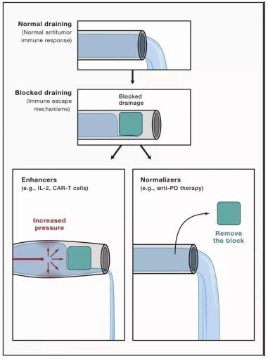 文章中將免疫反應(yīng)過程比作一條有流水的通道。在這個過程中,正常的免疫反應(yīng)就是通道中正常通暢的水流。如果通道堵塞,水流受到影響,通道將無法充分排水。在這種情況下,“增強”策略可以解釋為增加通道的壓力,以克服排水不足,但如果通道內(nèi)壓力增加太多,就會有破壞通道的風(fēng)險。反之,“正;辈呗詣t會通過識別并解除阻塞以恢復(fù)正常水流,避免危及通道管壁。