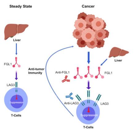 淋巴細(xì)胞活化基因3 (LAG-3)是一種主要存在于活化T細(xì)胞上的轉(zhuǎn)基因膜蛋白,其主要作用是作為一種表達抑制信號的受體。纖維蛋白原樣蛋白1 (FGL1)是一種肝臟分泌的蛋白質(zhì),可以抑制抗原特異性T細(xì)胞活化。
