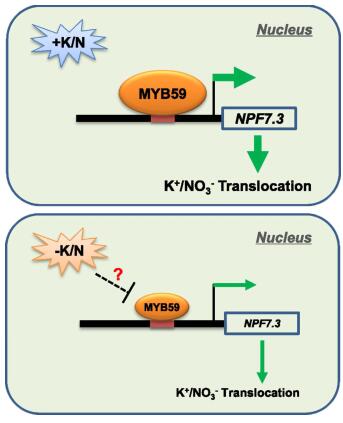 中國農(nóng)業(yè)大學武維華院士/王毅教授課題組、李繼剛教授課題組和德國明斯特大學Jörg Kudla教授課題組合作完成了擬南芥轉(zhuǎn)錄因子MYB59調(diào)控低鉀條件下K+/NO3-轉(zhuǎn)運的分子機制研究。2019年2月,Plant Cell在線發(fā)表了題為“The tranion factor MYB59 regulates K+/NO3-translocation in the Arabidopsis response to low K+stress”的研究論文。該研究揭示了擬南芥轉(zhuǎn)錄因子MYB59應答養(yǎng)分脅迫環(huán)境,并調(diào)控鉀和氮協(xié)同運輸?shù)姆肿訖C制。同時,Plant Cell編委還針對該研究內(nèi)容發(fā)表了題為“It's an uphill battle: The MYB59-NPF7.3 regulatory module and its role in nutrient transport”的專評。