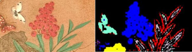 上左圖是一幅花鳥畫作品的局部,通過高光譜成像及SAM分類后可以看到,分類圖(上右圖)中的葉片邊緣跟里面是不一樣的,根據(jù)顏料的光譜反射特性和中國畫繪畫特點,推斷此處是在三綠上面覆蓋赭石,最后又覆蓋三綠的混合結(jié)果,這一深藏不漏的繪畫方式很大程度上豐富了視覺層次感。
