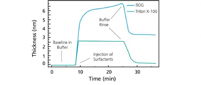 圖1. 表面活性劑Triton X-100和ßOG吸附到傳感器表面過程中,時(shí)間分辨的厚度變化。