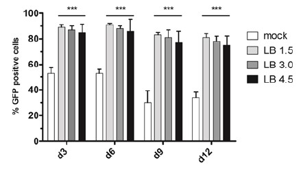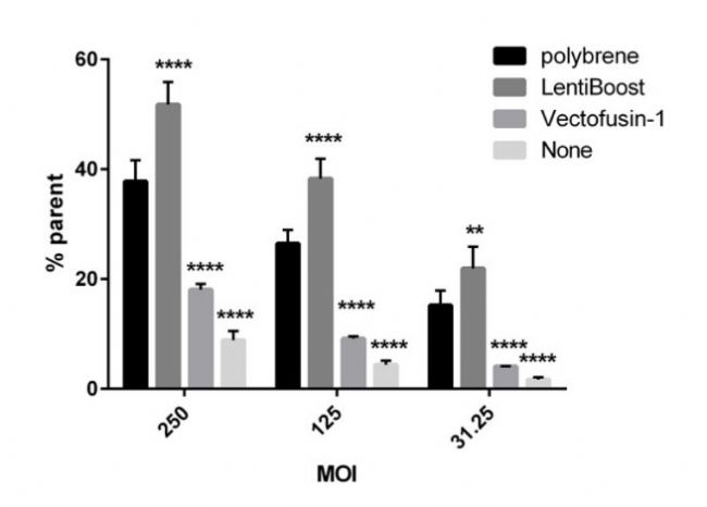 病毒顆的限制性攝取粒往往會降低基因或shRNA表達(dá)的成功率,并要求應(yīng)用更高的病毒滴度。然而,增加病毒數(shù)量以促進(jìn)表達(dá)可能會導(dǎo)致許多細(xì)胞類型的毒性副作用,并帶來不必要的昂貴成本。