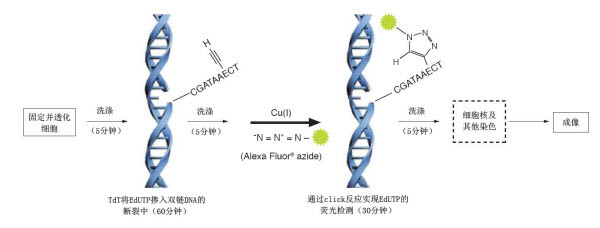 原位末端標(biāo)記法(TdT-mediated dUTP nick end labeling,TUNEL)是一種檢測(cè)凋亡細(xì)胞DNA鏈斷裂片段的方法。細(xì)胞凋亡發(fā)生時(shí),內(nèi)源性核酸內(nèi)切酶將DNA降解成片段,在脫氧核苷酸末端轉(zhuǎn)移酶的作用下,底物dUTP 或BrDU(無或有熒光標(biāo)記)可連接到DNA斷片的3-OH末端,采用熒光顯微鏡或流式細(xì)胞儀對(duì)標(biāo)記物進(jìn)行分析,實(shí)現(xiàn)在單細(xì)胞水平檢測(cè)凋亡細(xì)胞的DNA碎片。