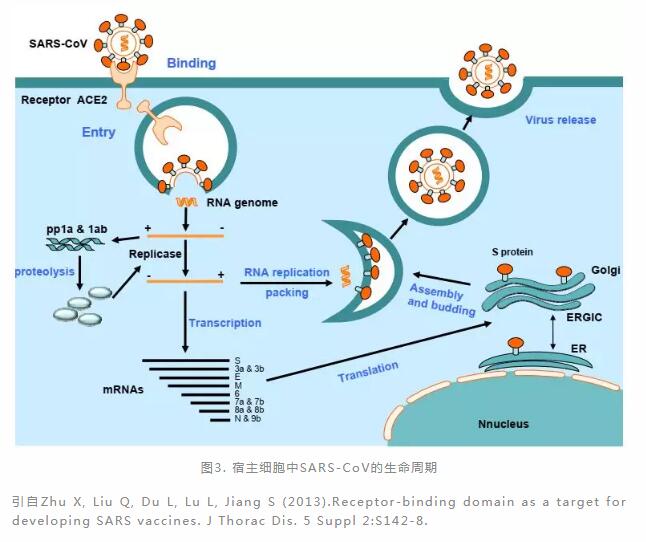 以SARS-CoV為例,SARS-CoV表面的Spike蛋白由與受體結(jié)合的S1亞基和介導(dǎo)膜融合的S2跨膜結(jié)構(gòu)域組成,S1亞基中的受體結(jié)合區(qū)(Receptor Binding Domain, RBD) 結(jié)構(gòu)域與粘膜細(xì)胞表面的受體血管緊張素轉(zhuǎn)換酶2(Angiotensin-Converting Enzyme 2,ACE2)結(jié)合,促使SARS-CoV進(jìn)入宿主細(xì)胞(圖2),隨后暴露病毒RNA,翻譯出病毒RNA復(fù)制酶,形成RNA復(fù)制酶-轉(zhuǎn)錄酶復(fù)合物。這種復(fù)合物通過(guò)復(fù)制和轉(zhuǎn)錄來(lái)形成RNA負(fù)鏈,在轉(zhuǎn)錄過(guò)程中,通過(guò)不連續(xù)轉(zhuǎn)錄產(chǎn)生7-9個(gè)RNA的子集,包括編碼所有結(jié)構(gòu)蛋白的RNA,翻譯成病毒的結(jié)構(gòu)蛋白。細(xì)胞質(zhì)中的RNA和結(jié)構(gòu)蛋白組裝成新的病毒顆粒,經(jīng)胞吐作用從被感染的細(xì)胞中釋放出來(lái),以感染新的細(xì)胞,由此逐漸蔓延至支氣管,肺部(圖3)。在這個(gè)過(guò)程中,ACE2就像是特洛伊木馬,幫助SARS-CoV進(jìn)入人體。
