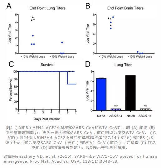 2016年North Carolina大學(xué)的Ralph S. Baric教授團(tuán)隊(duì)發(fā)表在PNAS上的一篇文章也證明了小鼠體內(nèi)過(guò)表達(dá)人源ACE2表現(xiàn)出對(duì)SARS-CoV和WIV1-CoV(以SARS-CoV為模板構(gòu)造的傳染性相對(duì)較弱的CoV,受體依然為ACE2,但是實(shí)驗(yàn)小鼠的死亡率降低,能獲得更多臨床前數(shù)據(jù))的易感,該團(tuán)隊(duì)創(chuàng)制了由肺纖毛上皮細(xì)胞啟動(dòng)子HFH4啟動(dòng)人源ACE2基因的轉(zhuǎn)基因小鼠,HFH4-hACE2小鼠中ACE2并沒有表現(xiàn)出預(yù)期的肺部特異表達(dá),在腦,肝,腎和胃腸道中也檢測(cè)到不同程度的表達(dá)。所有感染SARS-CoV的HFH4-ACE2小鼠的體重減輕了20%以上,并在肺和腦中檢測(cè)到SARS-CoV強(qiáng)大的復(fù)制能力,而在感染W(wǎng)IV1-CoV7天后體重減輕> 10%的小鼠在大腦中檢測(cè)到大量的病毒復(fù)制,但在肺中的復(fù)制明顯降低,體重減輕<10%小鼠的肺和腦中的病毒復(fù)制較低,且產(chǎn)生了足夠的適應(yīng)性免疫應(yīng)答以清除病毒并在感染后存活。該團(tuán)隊(duì)還找到一種單克隆抗體227.14,能夠保護(hù)HFH4-ACE2小鼠免受致命的SARS-CoV 和WIV-CoV攻擊,經(jīng)抗體治療后,HFH4-ACE2小鼠肺中均未檢測(cè)到病毒