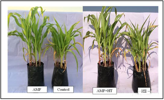 與對照植物以及AMF+HT和HT玉米植株相比,AMF植株的形態(tài)差異非常明顯。與對照植物相比,富含AMF的植物表現出更好的株高和葉寬(數據未顯示)。AMF+HT植株也表現出比僅HT植株更好的生長,表明AMF可以保護植株免受溫度誘導的傷害。