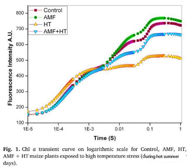 為了闡明AMF在調節(jié)光系統(tǒng)II異質性中的作用,此研究對高溫脅迫下富含AMF的玉米植株進行了研究。利用葉綠素a熒光誘導動力學研究了玉米對照、AMF、AMF+HT和HT的PSII異質性。