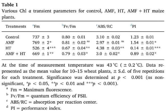 在這項研究中,在經歷高溫脅迫的植物中,O點至J點熒光減少,這表明PSII反應中心(RC)需要更多的時間來閉合,其次是次級電子的俘獲和緩慢還原。在經歷高溫的玉米植株中獲得了額外的K點,而在經歷類似條件的AMF+HT玉米植株中則沒有K點出現。K點的出現歸因于從OEC到RC的電子流有限。