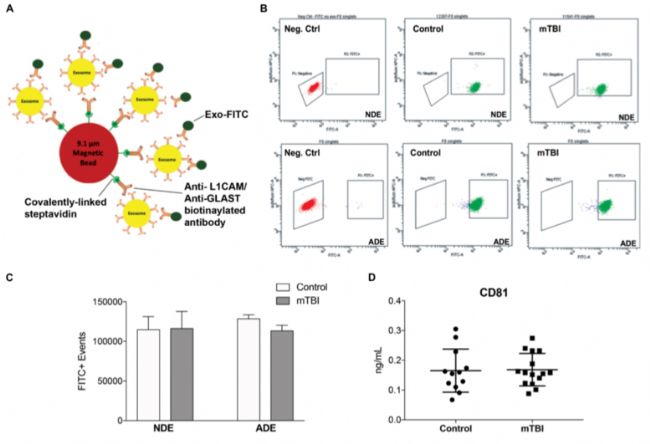 首先,研究人員使用結(jié)合有外泌體抗體和FITC復(fù)合物的磁珠來(lái)免疫富集人血漿中的NDEs和ADEs(圖1A)。使用CD171(神經(jīng)細(xì)胞粘附分子配體1)來(lái)特異性免疫捕獲NDEs;GLAST(谷氨酸/天冬氨酸轉(zhuǎn)運(yùn)體)用來(lái)免疫捕獲ADEs。富集后的復(fù)合物使用流式細(xì)胞儀根據(jù)綠色熒光強(qiáng)度進(jìn)行分類。陽(yáng)性對(duì)照為磁珠-抗體-外泌體-FITC復(fù)合物,陰性對(duì)照則為不含外泌體的磁珠-抗體-FITC復(fù)合物(圖1B)。由流式結(jié)果可知,實(shí)驗(yàn)組和對(duì)照組在FITC+的數(shù)量上沒有明顯差異(圖1C)。針對(duì)外泌體標(biāo)志物CD81的ELISA實(shí)驗(yàn)也顯示,實(shí)驗(yàn)組和對(duì)照組之間沒有明顯差異(圖1D)。