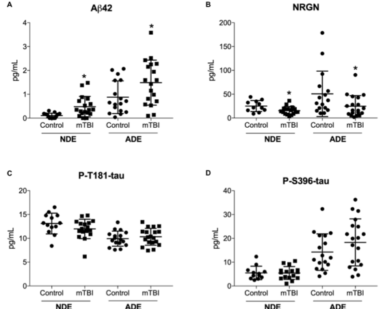 2.與對(duì)照組相比,mTBI患者血漿的NDEs和ADEs中Aβ42濃度水平較高,而NRGN的濃度水平較低