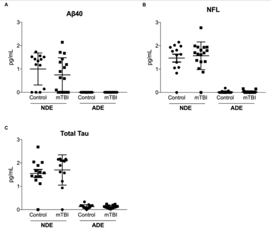 用超靈敏單分子免疫陣列分析平臺(tái)(Simoa平臺(tái))對(duì)血漿外泌體的蛋白定量顯示,在NDE組中,mTBI與對(duì)照的Aβ40(圖3A)、NFL(圖3B)和T-tau(圖3C)的濃度水平?jīng)]有顯著差異,而在ADE組中,mTBI與對(duì)照的Aβ40、T-tau和NFL的濃度水平在Simoa平臺(tái)上非常低,接近檢測(cè)不到。