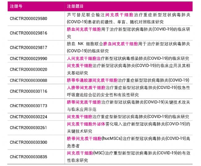 已有12項(xiàng)間充質(zhì)干細(xì)胞治療新型冠狀病毒肺炎(COVID-19)相關(guān)臨床研究登記注冊(cè)(數(shù)據(jù)來自http://www.chictr.org.cn/searchproj.aspx)。 |
