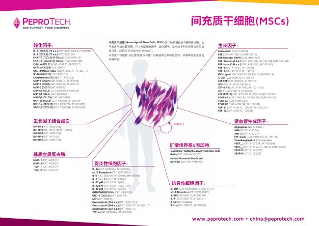 | PeproTech整理了200多篇文獻(xiàn)后,總結(jié)了全面的MSCs所分泌的細(xì)胞因子,如下面掛圖所示 |