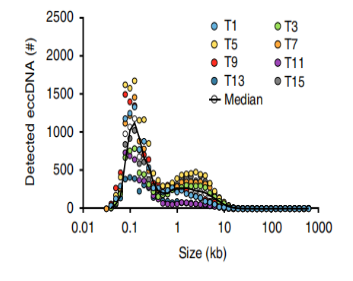 目前對(duì)eccDNA的大小還沒(méi)有定論,eccDNA大部分小于25kb,主要分布在0.1-5KB,但不同的文獻(xiàn)報(bào)道中表述略有差別。它們往往是一些特殊的基因區(qū)域形成的,可攜帶完整的基因和特殊的調(diào)控元件,能獨(dú)立完成復(fù)制過(guò)程,但不攜帶著絲粒和端粒結(jié)構(gòu)。