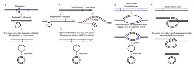 早期的研究發(fā)現(xiàn)eccDNA是基因擴(kuò)增的產(chǎn)物,是基因組不穩(wěn)定性的一種表現(xiàn)形式。腫瘤基因擴(kuò)增往往以?xún)煞N方式,一種是在染色體上進(jìn)行基因的擴(kuò)增,另一種則是形成eccDNA。目前關(guān)于腫瘤中eccDNA的形成機(jī)制還沒(méi)有定論。早期的研究認(rèn)為短重復(fù)序列是介導(dǎo)eccDNA形成的因素,主要通過(guò)基因重組機(jī)制實(shí)現(xiàn),也有一些模型認(rèn)為是在DNA復(fù)制過(guò)程中通過(guò)loop切除或在DNA復(fù)制暫停的時(shí)候復(fù)制泡中斷裂的DNA片段連接形成。2018年,Anindya Dutta等在他們的一篇綜述文章中用示意圖展示了各種可能形成eccDNA的分子模型。