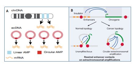 早期人們一直認(rèn)為eccDNA的存在是無(wú)意義的,直到2014年,Mischel實(shí)驗(yàn)室發(fā)現(xiàn)膠質(zhì)母細(xì)胞瘤對(duì)EGFR抑制劑的耐藥性是由eccDNA上的EGFRvIII功能獲得性突變的可逆性丟失引起的,人們才重新開(kāi)始注意ecDNA的功能。檢測(cè)結(jié)果發(fā)現(xiàn)在天然染色體位點(diǎn)上的癌基因擴(kuò)增相對(duì)較少,但是在癌癥中ecDNA的擴(kuò)增則較為普遍。2017年,Kristen等人通過(guò)比較腫瘤基因組和生殖細(xì)胞基因組之間的序列,發(fā)現(xiàn)在天然染色體位點(diǎn)上的癌基因擴(kuò)增相對(duì)較少,但是在癌癥中eccDNA的擴(kuò)增則較為普遍。隨后,越來(lái)越多的實(shí)驗(yàn)都表明,eccDNA的存在是強(qiáng)大且普遍的,它可以使癌基因在腫瘤細(xì)胞中的拷貝數(shù)大量增加,而這對(duì)于染色體擴(kuò)增來(lái)說(shuō)是很難實(shí)現(xiàn)的。