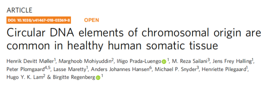 4. Møller Henrik Devitt,Mohiyuddin Marghoob,Prada-Luengo Iñigo et al. Circular DNA elements of chromosomal origin are common in healthy human somatic tissue.[J] .Nat Commun, 2018, 9: 1069.