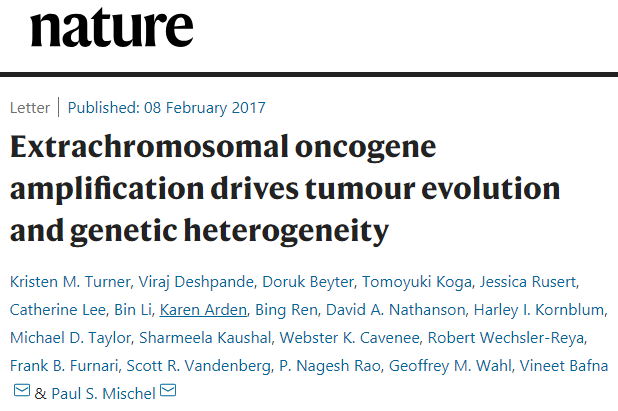 2017年,Nature上發(fā)表了一篇由加州大學(xué)圣地亞哥分校的Paul Mischel教授領(lǐng)導(dǎo)的研究團(tuán)隊(duì)完成的研究,共分析了17種不同的癌細(xì)胞的eccDNA。發(fā)現(xiàn)ecDNA是腫瘤的關(guān)鍵特征,它可以編碼多種促進(jìn)腫瘤發(fā)生發(fā)展的基因。此外,他們還發(fā)現(xiàn)ecDNA在腫瘤細(xì)胞發(fā)生、產(chǎn)生多樣性及耐藥性過(guò)程中發(fā)揮的作用遠(yuǎn)遠(yuǎn)大于位于染色體中的相同基因發(fā)揮的作用,即
