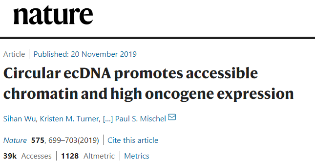 1. Wu Sihan,Turner Kristen M,Nguyen Nam et al. Circular ecDNA promotes accessible chromatin and high oncogene expression.[J] .Nature, 2019, 575: 699-703.