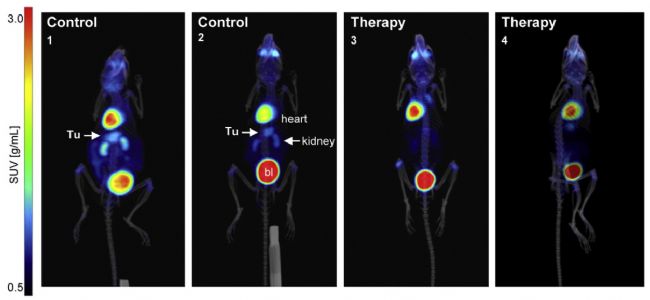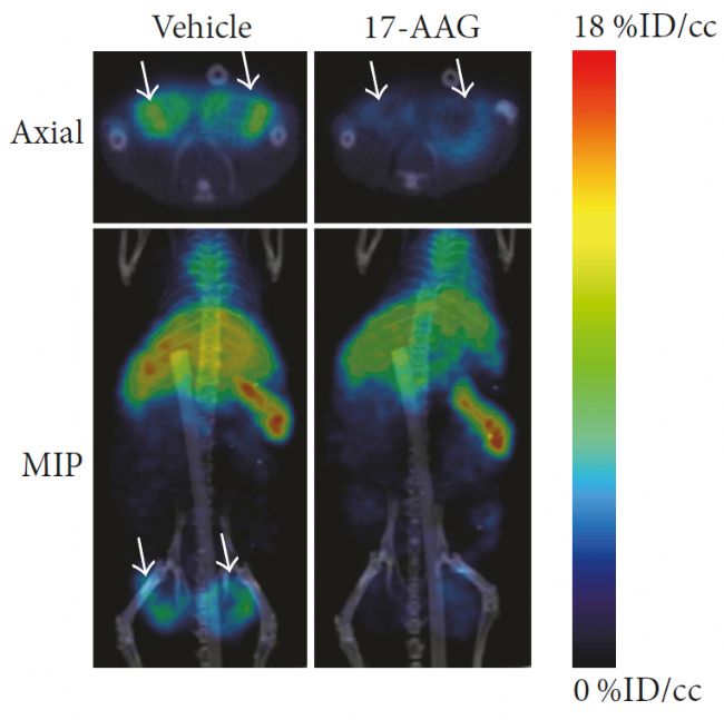圖2、64Cu-anti-hAXL靜脈注射24小時后小鼠體內(nèi)MDA-MB-231腫瘤異種移植物的micro PET/CT圖像。治療組每日注射17-AAG,并顯示出64Cu-anti-hAXL的腫瘤攝取量低于對照組。