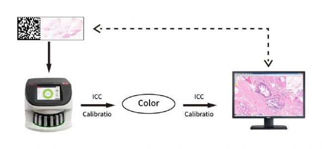 眾所周知,顏色在病理閱片中具有舉足輕重的地位。遺憾的是,在GT450上市之前,并未出現(xiàn)過專門針對(duì)顯微鏡光路的色彩校正方案。為此Leica Biosystems采用了專用的光譜分析工具,對(duì)數(shù)字圖像、顯示器以及實(shí)際顯微鏡下圖像進(jìn)行校正,并根據(jù)國際色彩協(xié)會(huì)(ICC)的標(biāo)準(zhǔn)生成了色彩校正方案。GT450也是第一個(gè)具備數(shù)字病理專門準(zhǔn)備的校正方案的新一代智能掃描儀。