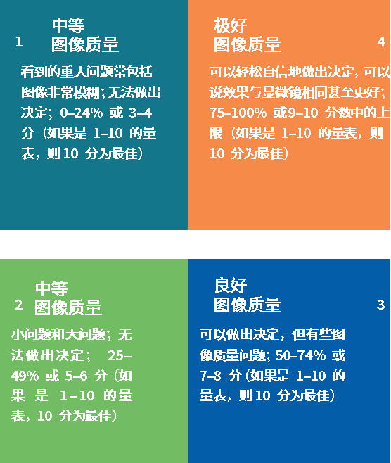 與常用的百分制或十分制不同,Leica Biosystems采用象限打分的模式來評(píng)估圖像質(zhì)量。象限打分不僅可以避免病理學(xué)家在打分時(shí)的糾結(jié)(比如一個(gè)優(yōu)秀的圖像應(yīng)該是打8分還是9分?),也能簡(jiǎn)潔明確的顯示閱片者對(duì)于圖片質(zhì)量的滿意度。