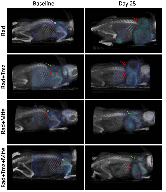 18F-FDG腫瘤攝取情況,包括單獨(dú)放療(Rad)、Rad + 替莫唑胺(Tmz)、Rad+米非司酮(Mife),以及Rad + Mife + Tmz。Rad + Tmz是針對膠質(zhì)母細(xì)胞瘤的典型治療方案,但研究發(fā)現(xiàn),使用Mife作為激活劑比其它療法組合更能抑制腫瘤生長(圖1)。目前尚未能徹底闡明Mife的這種化學(xué)放射增敏作用的機(jī)制,但這類研究有助于研究人員朝著改進(jìn)現(xiàn)有癌癥治療方法的方向邁出重要的一步。