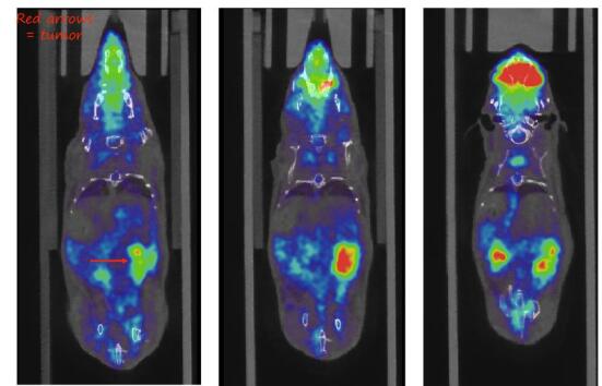 圖 3. PET-PDAC 小鼠模型(12.11MBq(327µCi) [18F]FDG, 采集時(shí)間: 10min) , 研究胰腺腫瘤, 發(fā)現(xiàn)腎臟也有轉(zhuǎn)移【1】 。