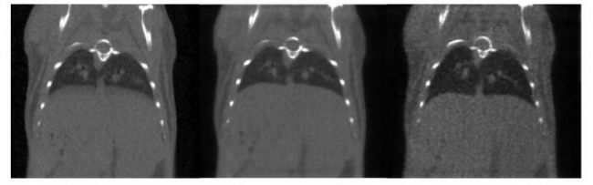 CT 呼吸門控圖: 超高時(shí)間分辨率(10ms) , 4min, 390mGy。 左圖: 整體整合的圖。 中圖: 呼氣結(jié)束時(shí)的圖, 右圖: 吸氣結(jié)束時(shí)的圖, 兩者顯示肺的容積相差 34%【1】 。