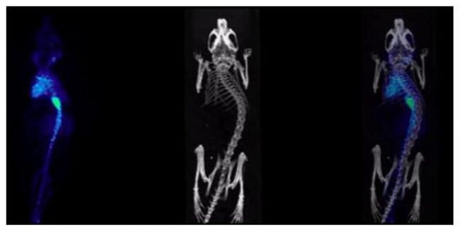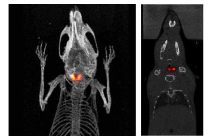 圖 8. 來自肺腫瘤模型研究的小鼠的 PET(左)和 PET/CT( 右) 圖像, 6.47MBq( 175μ Ci)