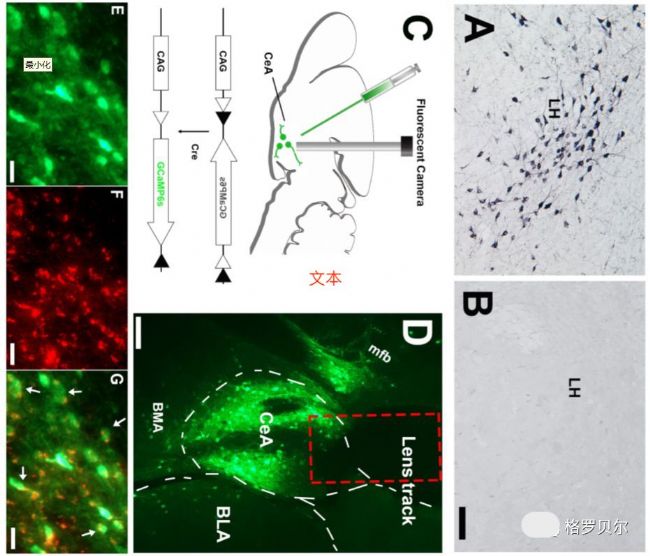 研究人員敲除了小鼠的促食素基因(圖1B,促食素免疫染色),從而得到嗜睡癥模型動物。該促食素缺失小鼠與Slc32a1-ires-Cre+/+小鼠雜交,在后代基因組中插入GCaMP6s基因,得到了GABAergic神經元可以特異性表達鈣指示熒光蛋白的嗜睡癥模型小鼠(圖1 C-G,綠色為鈣熒光,圖F為GABAergic神經元指示物VGAT染色照片,與圖E鈣熒光重合度95%),作為實驗組。促食素未敲除的轉基因小鼠(圖1A)作為對照組。
