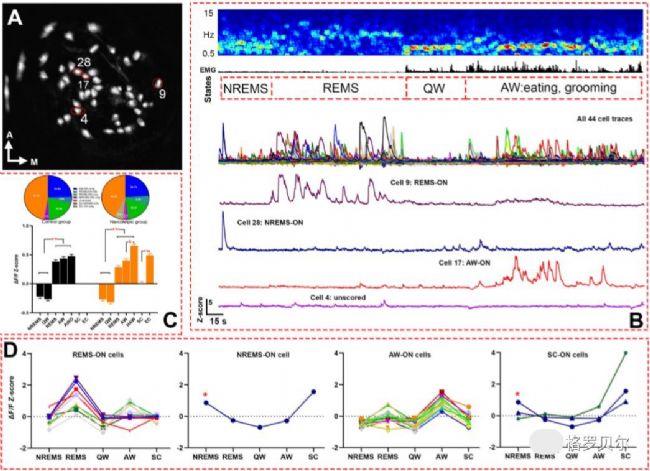 研究人員對實驗組和對照組各5只小鼠在睡眠和情緒階段進行了鈣成像和腦電肌電監(jiān)測(圖2A,B),鈣成像在兩個組別中各識別出了186個和207個GABAergic神經元細胞。研究發(fā)現(xiàn),不同的GABAergic細胞會在睡眠的不同階段被激活,使用Δf/f來表征細胞熒光強度的變化幅度,計算各階段細胞Δf/f的Z分數(shù)來剔除細胞數(shù)量干擾。圖2B展示了4種典型的細胞,分別為在快速動眼睡眠REMS階段激活、在非快速動眼睡眠NREMS階段激活、在活躍清醒AW階段激活和幾乎不激活。在各睡眠和清醒階段的細胞分布比例上,兩組別沒有顯示出顯著的區(qū)別。