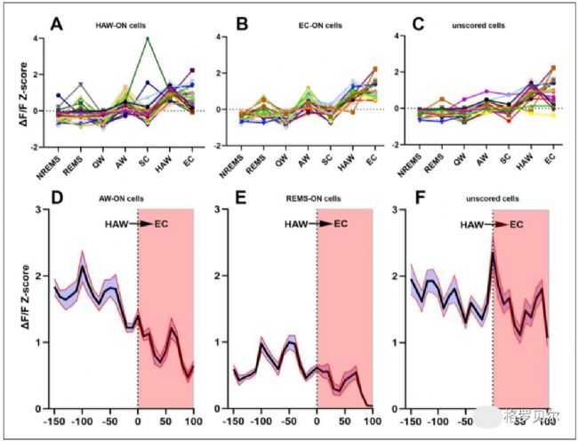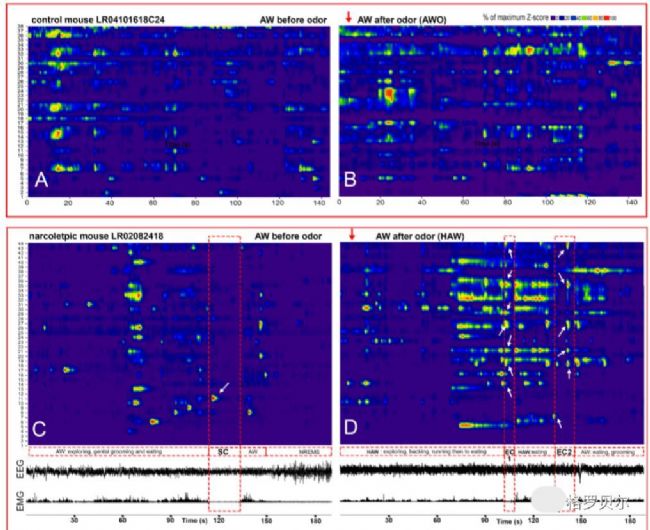 在不受干擾的睡眠與清醒狀態(tài)結束后,小鼠被暴露于狼尿的氣味刺激下,兩組小鼠均表現(xiàn)出了典型的好奇與恐懼反應。對照組小鼠在該階段的Z分數(shù)有明顯提高,但統(tǒng)計學上不顯著(P=0.46,圖2C)。然而在嗜睡病小鼠中,經過3分鐘的氣味暴露,Z分數(shù)顯著升高(P<0.001,圖2C,圖3);呈現(xiàn)激活狀態(tài)細胞的比例從31.88%提升到了60.22%,幾乎翻了一倍。研究人員將這種受刺激后Z值明顯高于未受干擾時平均Z值的AW定義為過度活躍清醒HAW,將由這種HAW引發(fā)的卒倒定義為情緒介導的卒倒EC。相反的,如果卒倒前只有普通的AW,這次卒倒則被定義為自發(fā)性卒倒SC。
