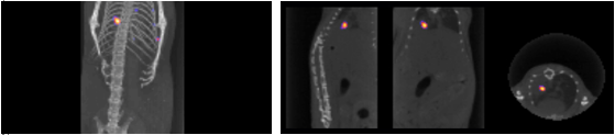 使用FLECT設(shè)備、Cy5.5探針對A-549肺癌進(jìn)行成像。圖像由法國國家科研中心(CNRS)的S.Pesnel 和A. LePape博士提供。對于病毒學(xué)和呼吸系統(tǒng)疾病,傳統(tǒng)上采用PET模式進(jìn)行臨床前的成像研究。另一方面,也有研究者進(jìn)行了大量利用熒光(以及生物發(fā)光)報告基因來進(jìn)行成像的工作。由于傳統(tǒng)的光學(xué)成像系統(tǒng)在小鼠深層組織成像方面的效果難以令人滿意,因此,大多數(shù)的熒光標(biāo)記采用離體的肺部器官進(jìn)行分析。從上面的示例圖像中可以看到,InSyTe系統(tǒng)的FLECT技術(shù)可以在活體小鼠中觀察到深入肺部組織的熒光探針信號。