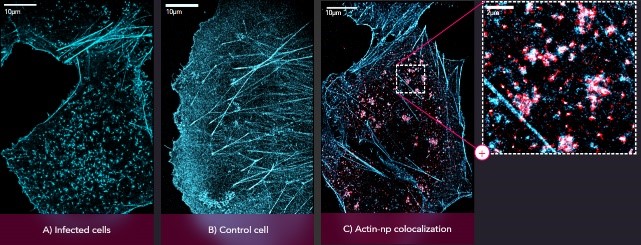 A) 被感染后的細(xì)胞;B) 健康細(xì)胞;C) 病毒共定位(核蛋白,肌動(dòng)蛋白)