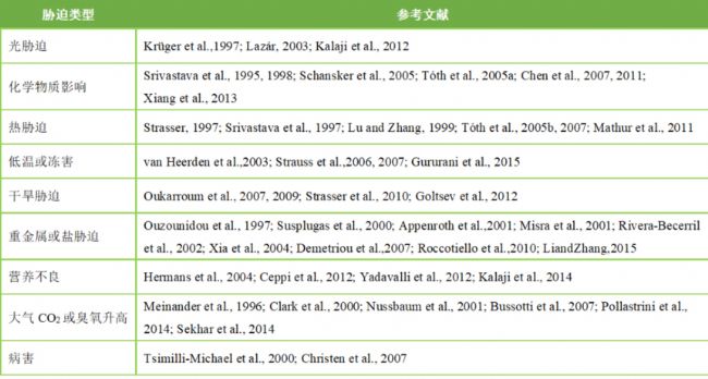 表1.JIP-test在各種植物脅迫研究中的舉例