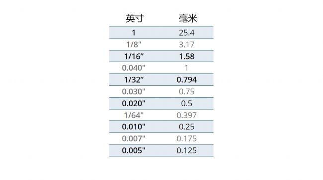 微流體導(dǎo)管尺寸通常以英寸表示,有時也會以英寸和毫米二者的混合形式表示,下表為常見的英寸-毫米單位轉(zhuǎn)換表。