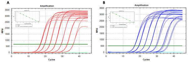 圖2. 一步法RT-qPCR染料法熒光定量試劑盒(紅色)與Competitor T試劑盒(藍(lán)色)產(chǎn)品的性能比較。對(duì)HeLa細(xì)胞RNA提取物中GAPDH和Actin水平進(jìn)行分析,RNA提取物以10倍梯度稀釋成7個(gè)樣本,總量的范圍為100 ng至0.1 pg。 A.HeLa細(xì)胞提取物中GAPDH擴(kuò)增曲線(xiàn)的比較; B.HeLa細(xì)胞提取物中Actin擴(kuò)增曲線(xiàn)的比較。